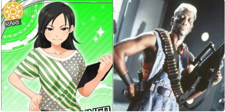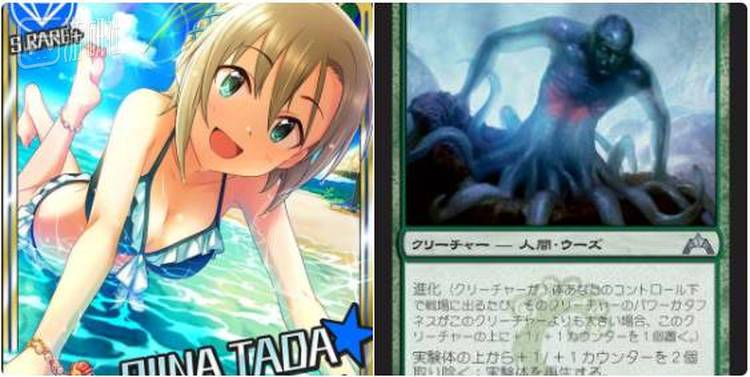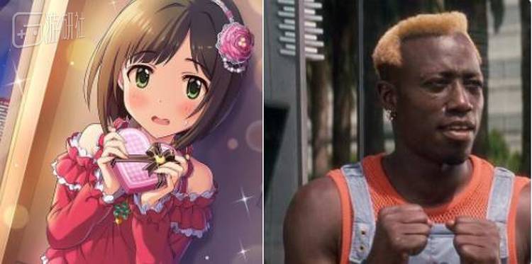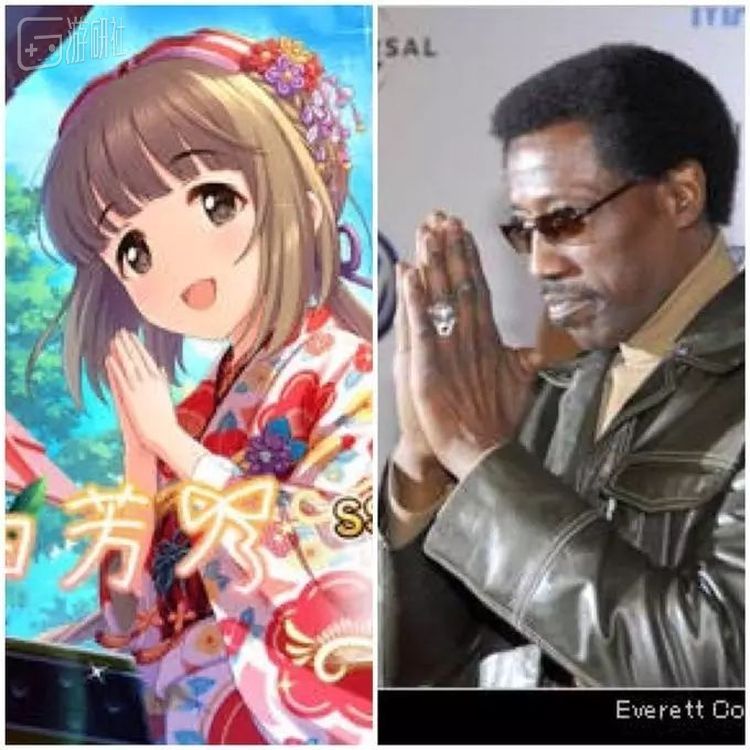 游戏运营的时间也不短了,游戏粉丝们在闲暇时间想找些乐子,不知是谁想了个“把偶像大师卡牌放大后跟XX有类似构图”的梗,开始在推特上自High,结果这一搞就停不下手来,偶像们先后跟各类人等“合影”,看着有股莫名的喜感。