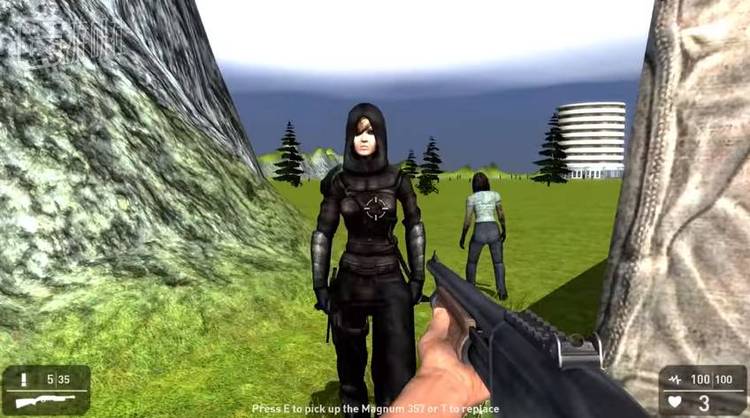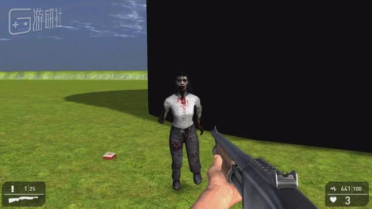 在经过了漫长的载入之后,终于能来到游戏画面。从一个帐篷中出来,你能做的就只有击杀冲过来的僵尸,以及凭空出现的刺客。而这个刺客除了建模之外,与普通僵尸并没有什么不同。子弹击中后也并无任何反馈,只有击杀之后死亡动作。