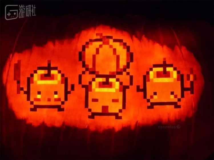 除了上面这些普通的爱好者之外,还有一些在南瓜灯制作方面颇有造诣的大佬,经常能掏出一些令人眼前一亮的作品出来。比如这位Ceemdee就凭着一手像素风南瓜灯,赚足了大家的眼球。