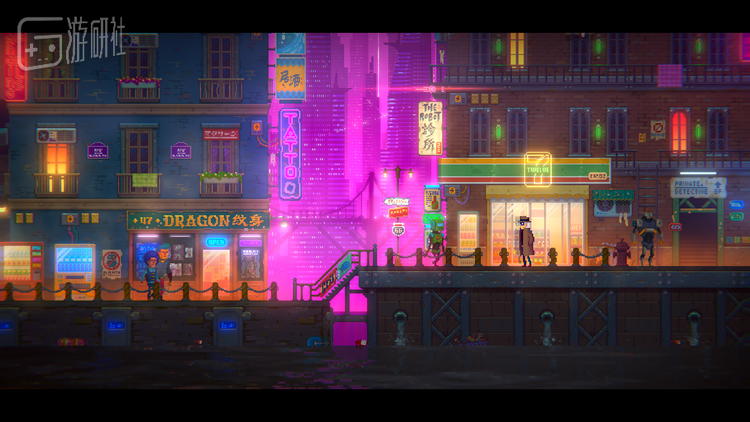 为了让像素画风更富于多变,展现灯红酒绿的“赛博朋克城市”,他们在画面的光影特效上花费了不少心思。