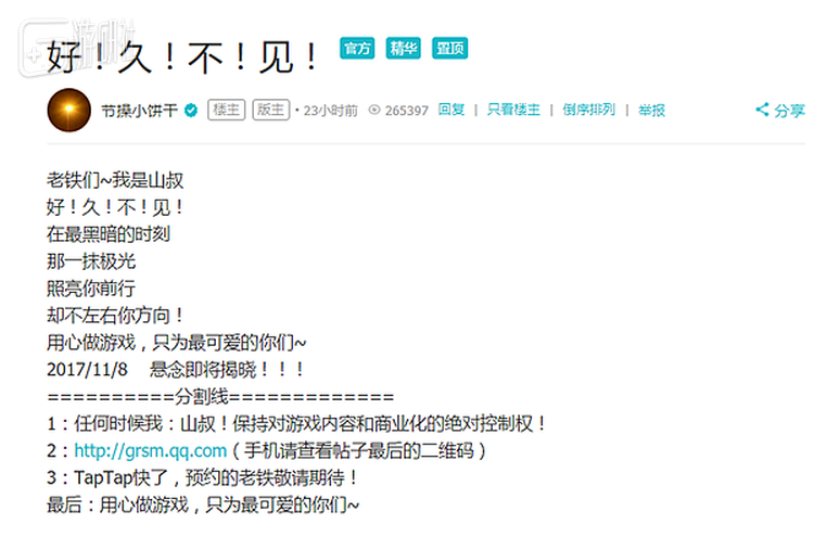 这种“卖人设”的策略,在用户数量快速增长但又相对封闭的TapTap社区极为奏效。山叔成了社区里的偶像、明星,成了《光荣使命》的精神图腾,一言九鼎,被奉为绝对的真相,抢到跟帖前排的人甚至会激动不已。直到今天,你去《光荣使命》的社区论坛,依然能看到很多为山叔打Call,尽管在TapTap之外,没人听说过山叔。