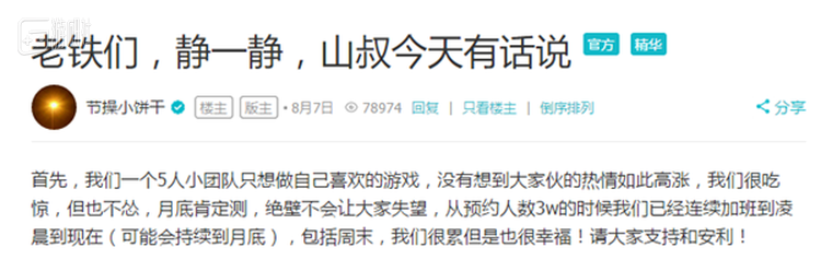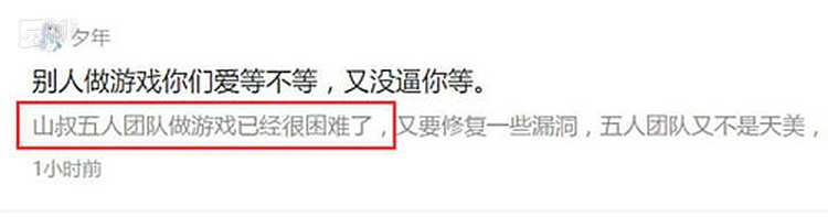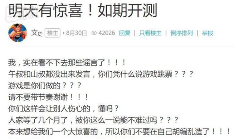 8月30日,原定第二天的测试迟迟没有下文,玩家们开始怀疑,这时有山叔粉丝力排众议来辟谣,“山叔都没出来发言,你们凭什么说游戏跳票?” 结果游戏跳票到了现在