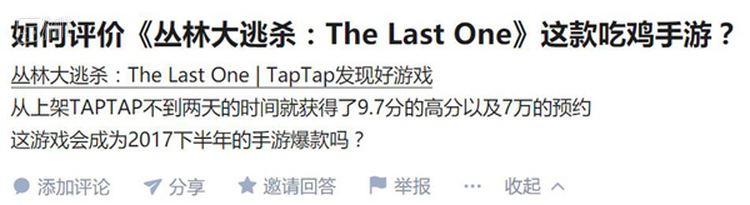 需要注意的是,这些天宣传十分高调的吃鸡手游如《小米枪战》《荒野行动》,并非为第一批尝试吃鸡的手游。在他们之前还有一整支队伍,有四五款同类产品的数据相当不错,其中《光荣使命》的前身《丛林大逃杀》,是首个在TapTap上达到百万预约以上的游戏。