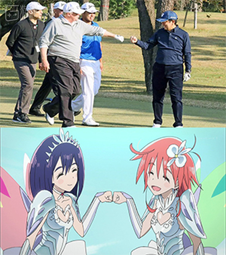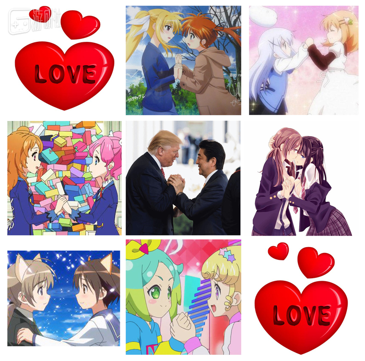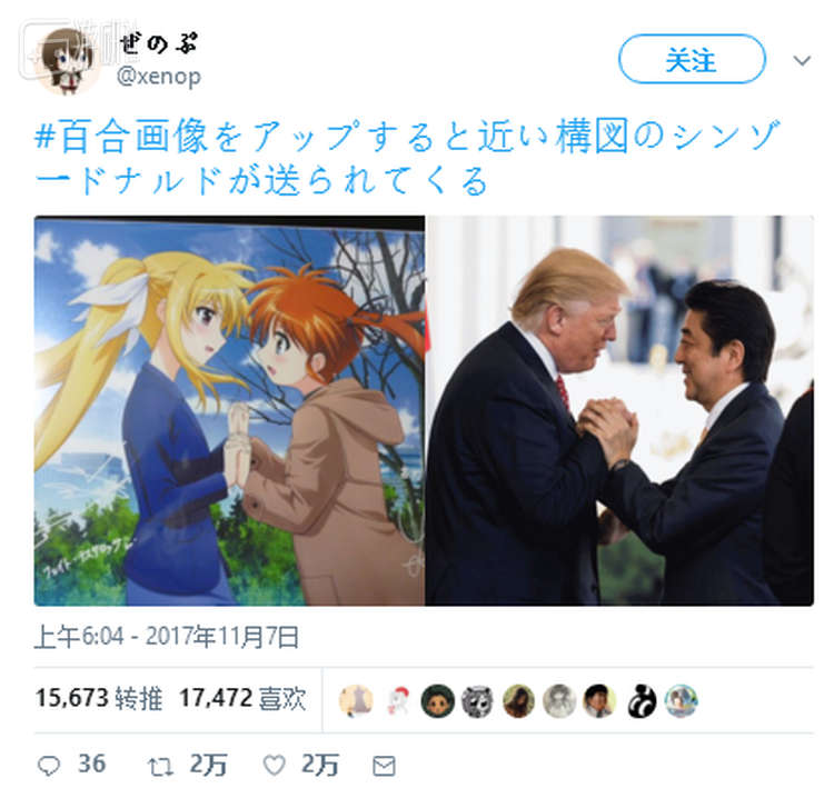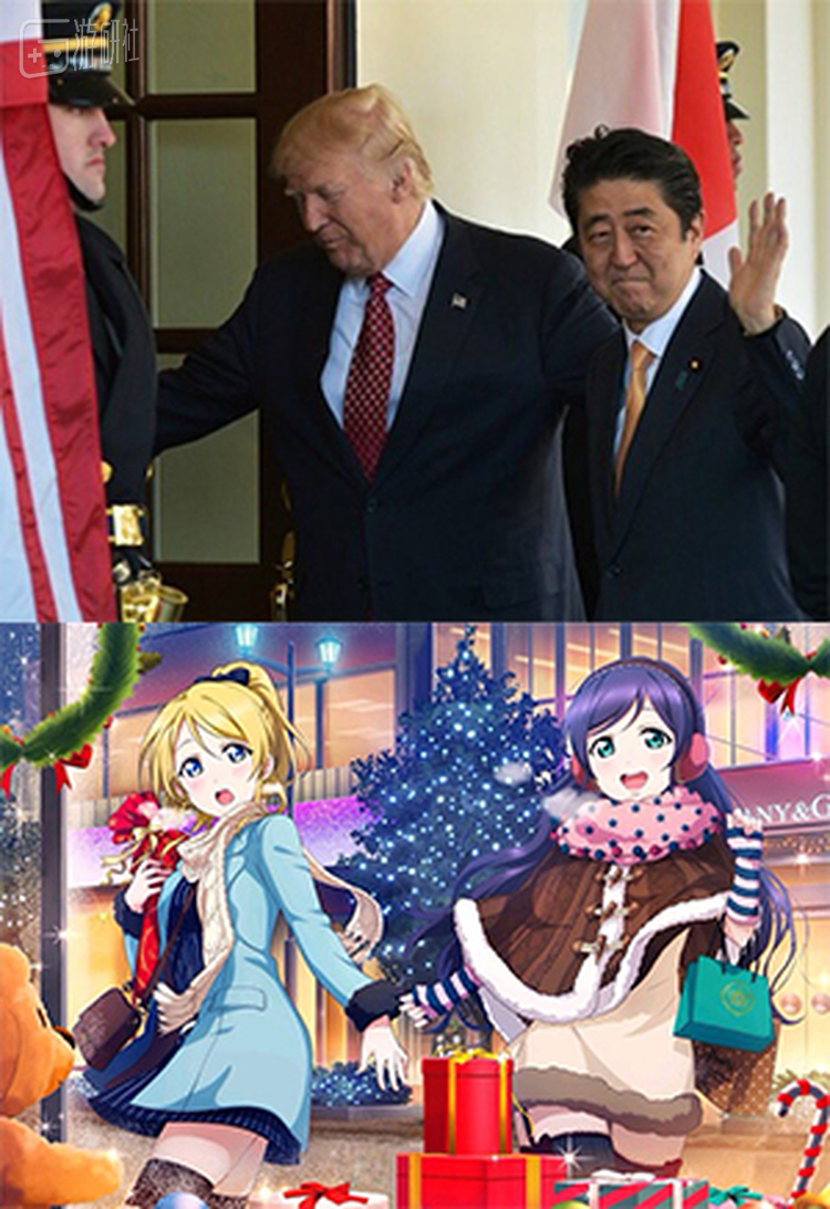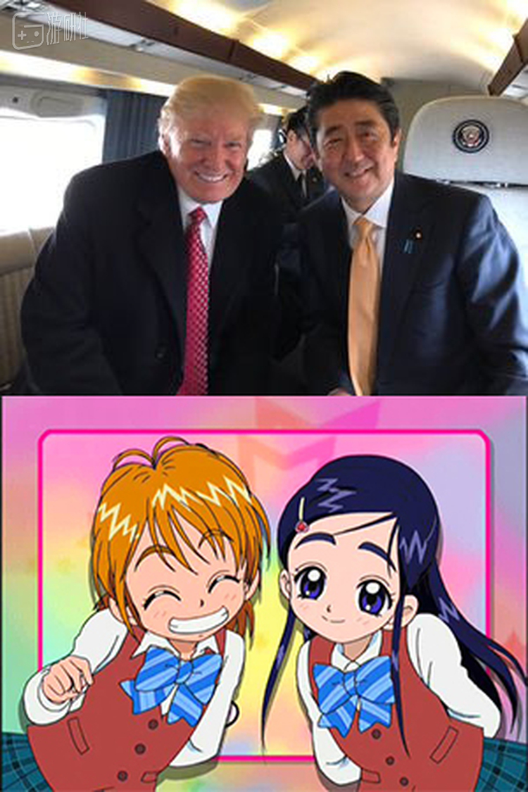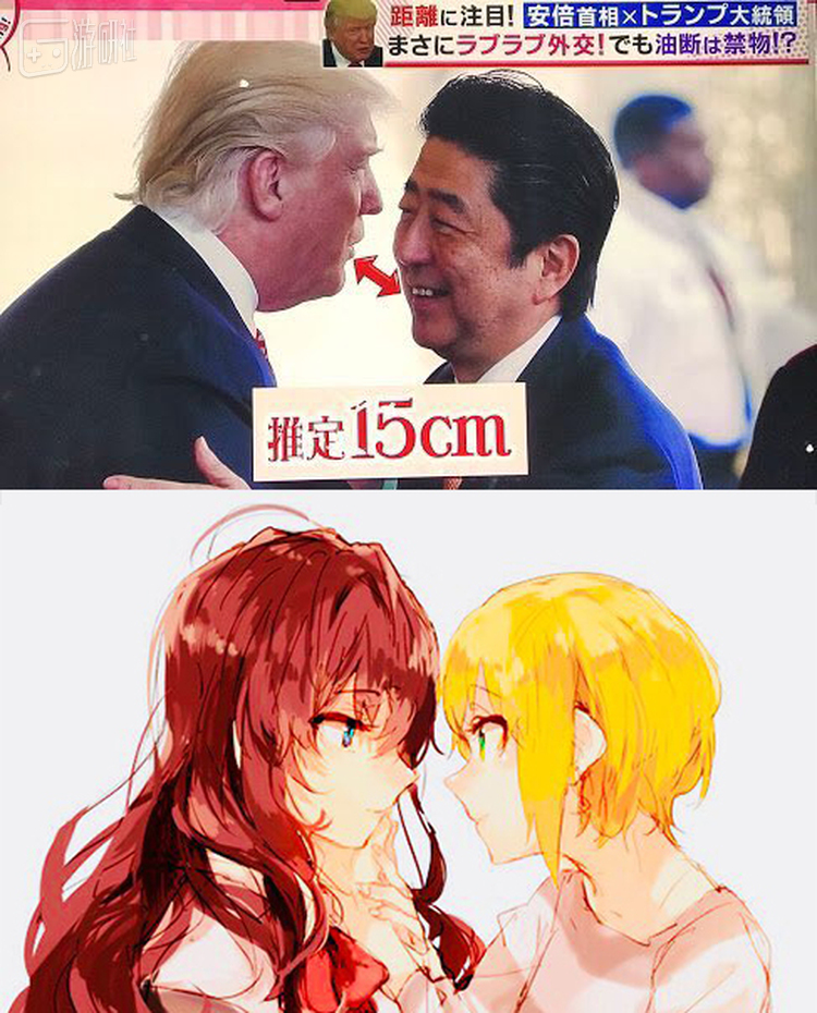后来随着他们行程的进一步曝光,有更多的朋友发现他们合影的构图有很多都与百合场景非常相似。明白这个道理之后,各位娱乐精神旺盛的网友们可不会放过这剂现成的猛料。在大家的踊跃参与下,推特上也就出现了“百合场景相似构图的晋三·唐纳德”话题活动。