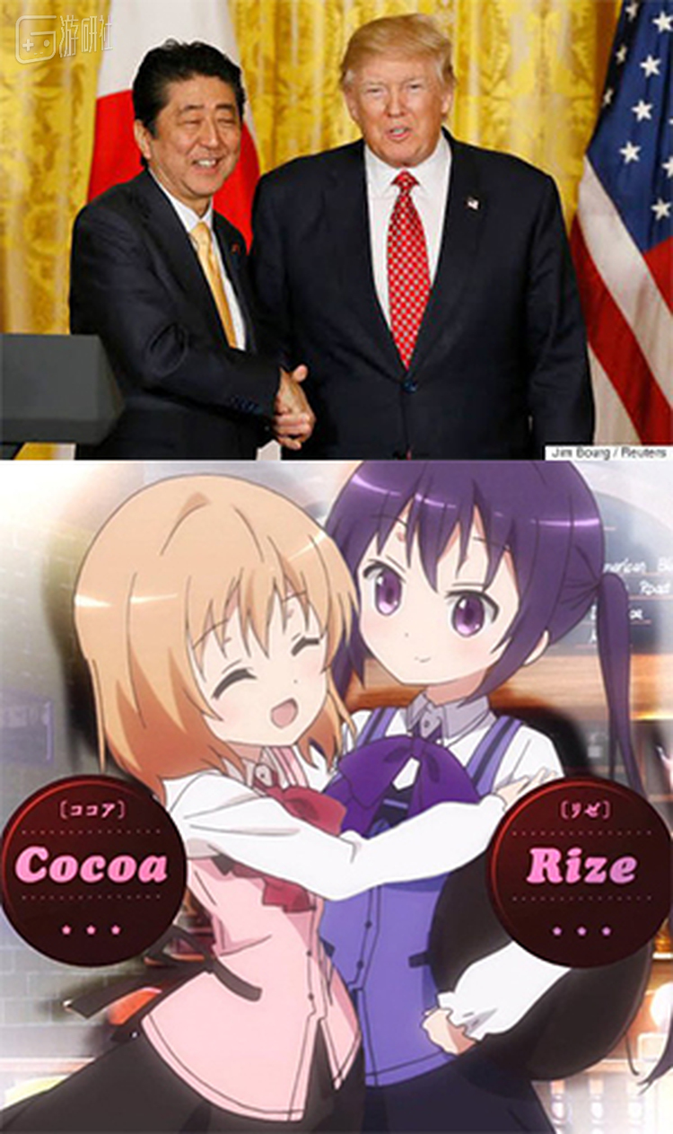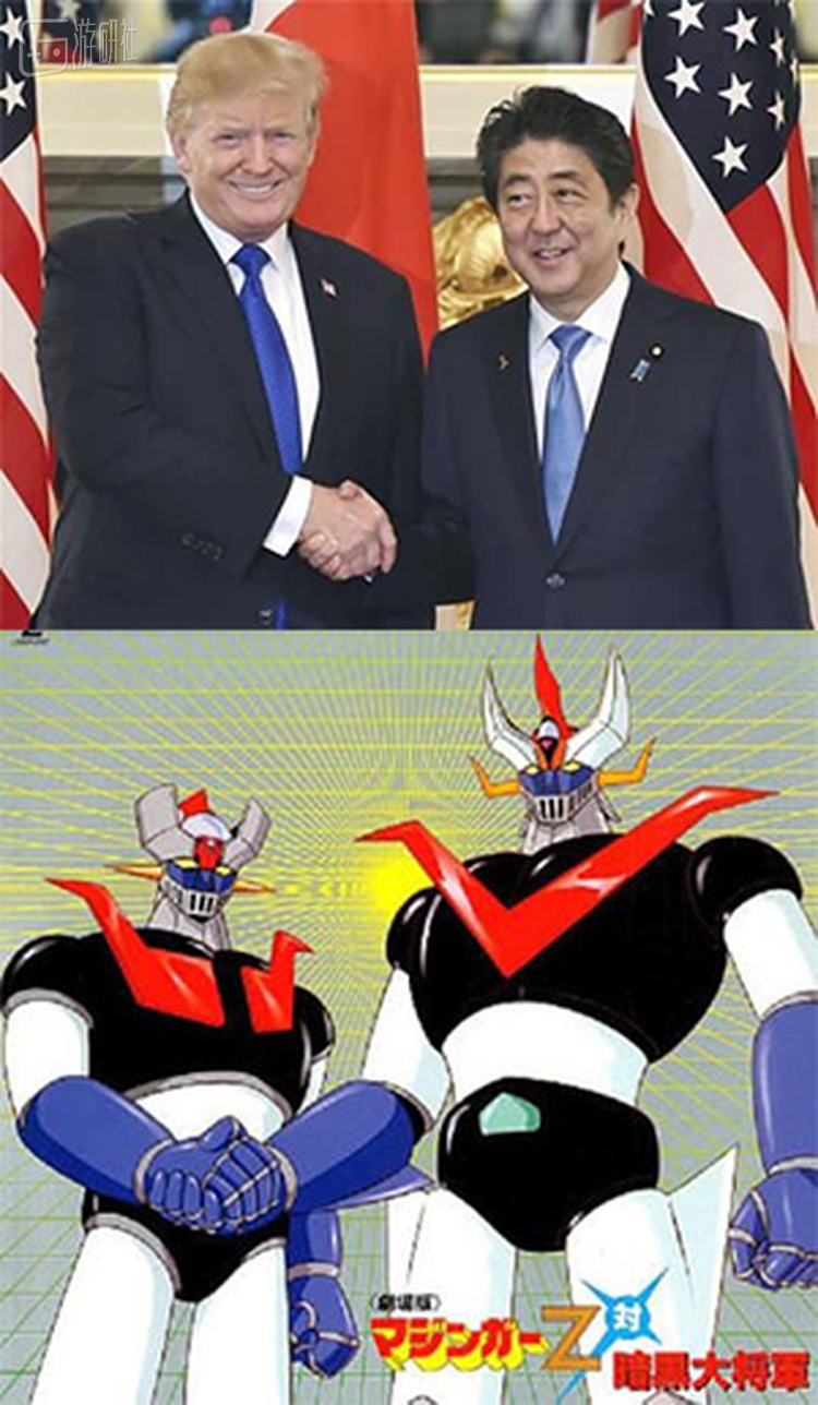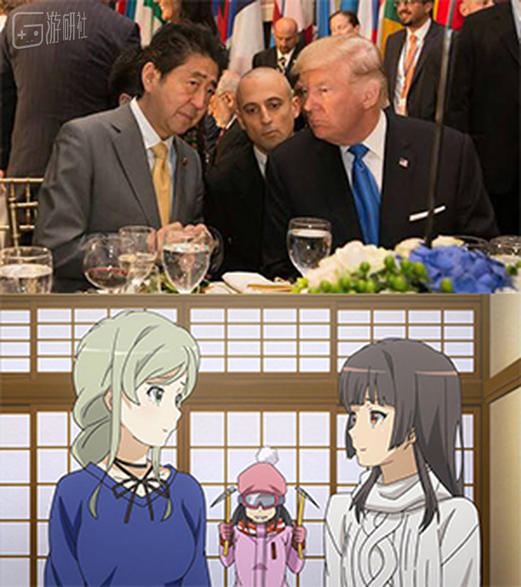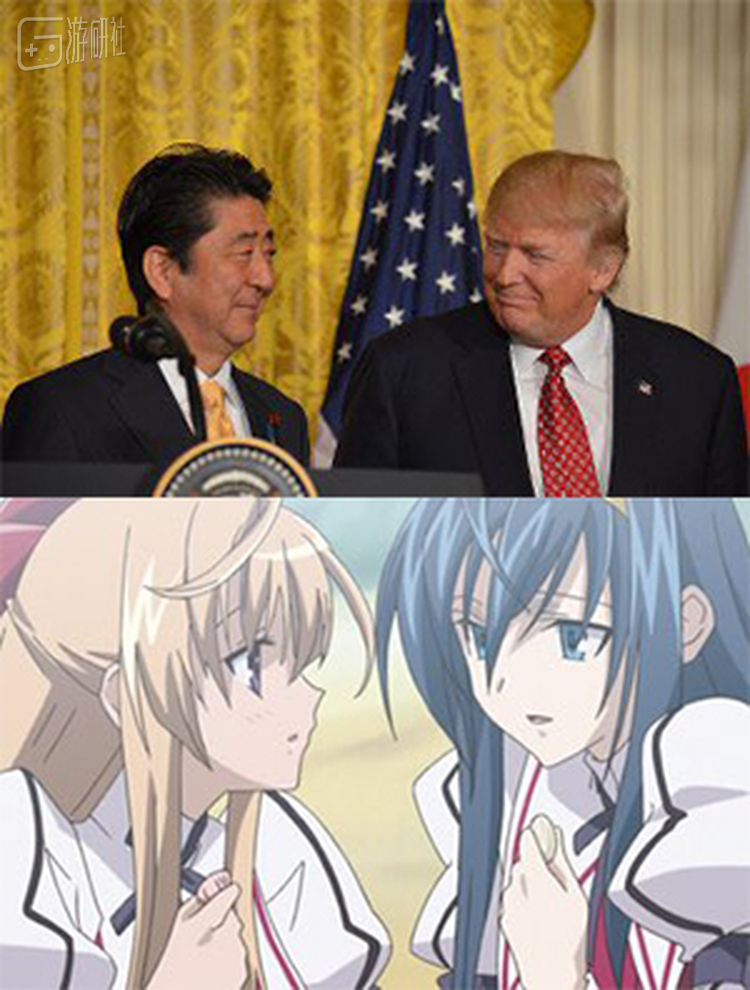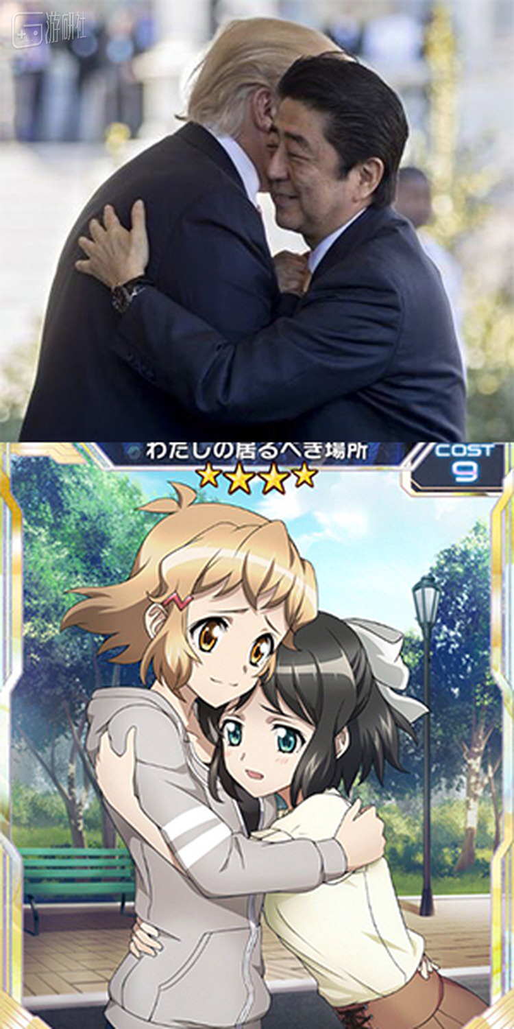 后来随着他们行程的进一步曝光,有更多的朋友发现他们合影的构图有很多都与百合场景非常相似。明白这个道理之后,各位娱乐精神旺盛的网友们可不会放过这剂现成的猛料。在大家的踊跃参与下,推特上也就出现了“百合场景相似构图的晋三·唐纳德”话题活动。