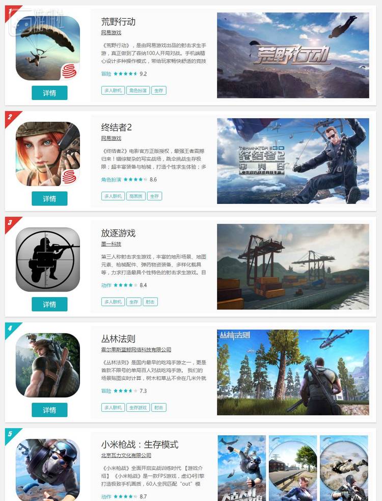 而在TapTap的预约榜前列,一度80%是“吃鸡”手游,其中包括一些小团队的作品,如《丛林法则》等,不过在进入玩家测试阶段后便因为质量粗糙而让很多玩家大为失望。在开发资源、技术上更有优势的大厂的作品也陆续出现,网易的《终结者2》《荒野行动》等手游在TapTap上也获得了巨大的预约量和玩家关注。
