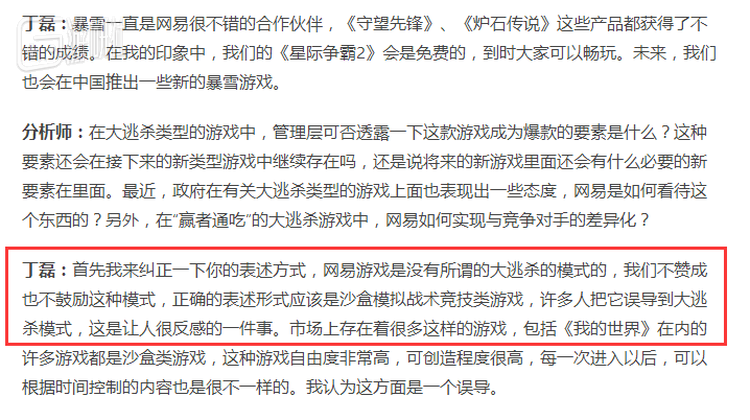 在第三季度财报的电话会议上,丁磊否认自己的游戏是“大逃杀”模式