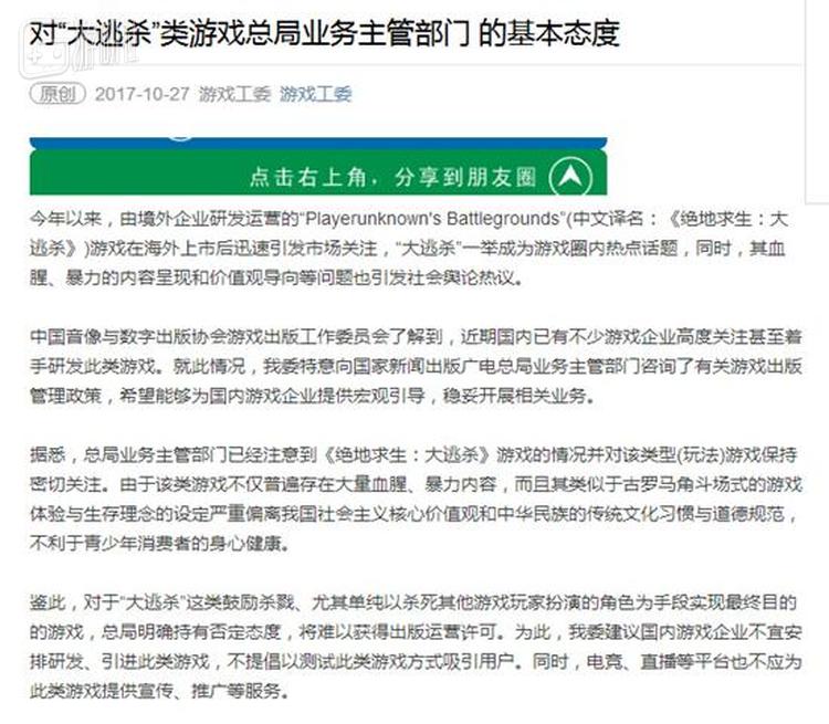在小米召开宣布测试开启的新闻发布会当天,网易发表公告称“将严格按照国家管理部门的指导意见,尽快对相关类型的游戏进行修改与调整,确保游戏作品传递的理念符合社会主义核心价值观,在游戏中倡导中华民族的传统文化习惯与道德规范”。随后,此前一段时间内“大逃杀”类手游最受关注的平台TapTap也发公告,表态支持主管部门对“大逃杀”类游戏指导意见。