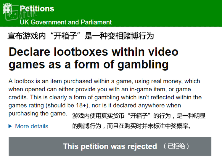 作为欧洲最重要国家之一的英国,早在10月初,就有玩家在政府请愿网站Petition上,要求将类似“开箱子”的玩法纳入监督,不过相应寥寥。