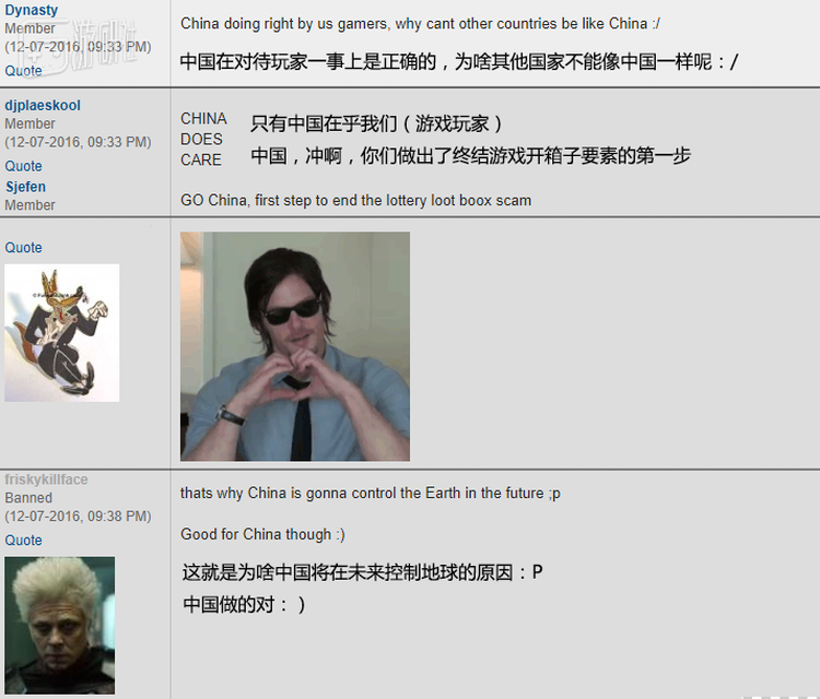 所以在国外论坛上,也难怪会产生“还是中国最关心玩家”的论调了(下面的图片来自于NeoGAF论坛)。
