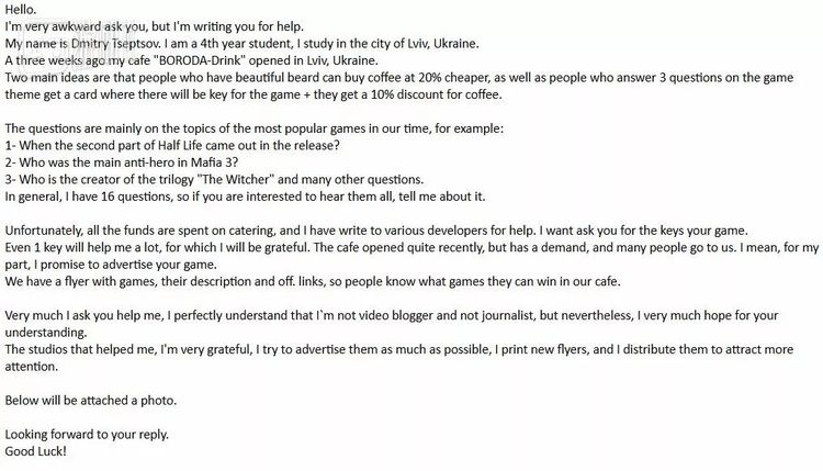 三天前,他收到了一位自称叫做Dmitry的乌克兰大四学女生写来的邮件。内容大致意思是讲,自己刚刚开了一家叫做“Boroda Drink”游戏主题的咖啡厅,她会向顾客提问一些游戏相关问题,答对的可以享受八折优惠,还能获赠游戏。虽然咖啡厅开业时间不长,但是很受欢迎。因为装修已经花了不少钱,所以希望能从开发者这里获得一些游戏激活码作为支持。