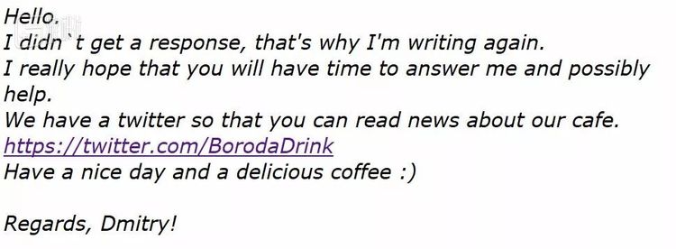 就在Janerka犹豫的时候,美少女Dmitry发来了第二封邮件,除了询问“为什么你没有回复我?”之外,甚至还提供了一个和咖啡厅同名的推特地址。