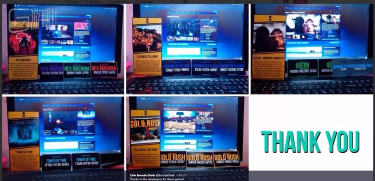 其中的一条推特是这样的:她把之前一些开发者送给她的激活码打印到了卡片上,放在Steam页面旁边做成了合影,就像是在炫耀自己的战利品一样。