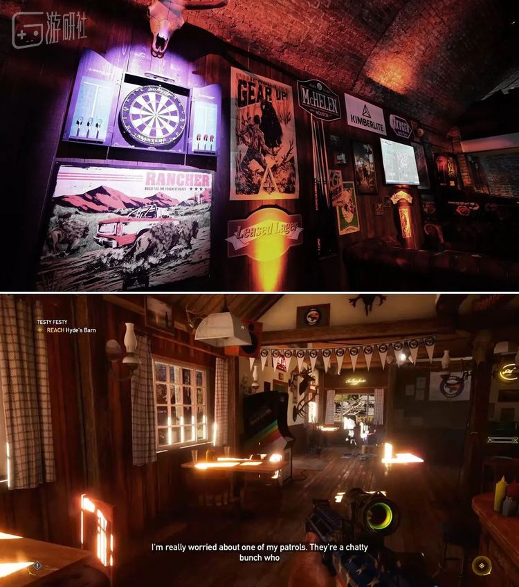 就像育碧的其他游戏一样,《孤岛惊魂》系列历代都拥有着非常庞大的开放世界,从遥远的无人岛屿到神秘的青藏高原。到了5代,游戏场景设定在了美国西部的蒙大拿州。试玩的会场安排在了一家很有情调的摩托酒吧,在伦敦老街附近。在此之前,育碧的工作人员已经把这里布置成了游戏中“展翼之鹰酒吧”的样子——墙上的复古海报,硕大的电子点唱机,蓝粉色霓虹灯装饰,当然还有吧台附近的野牛头骨。