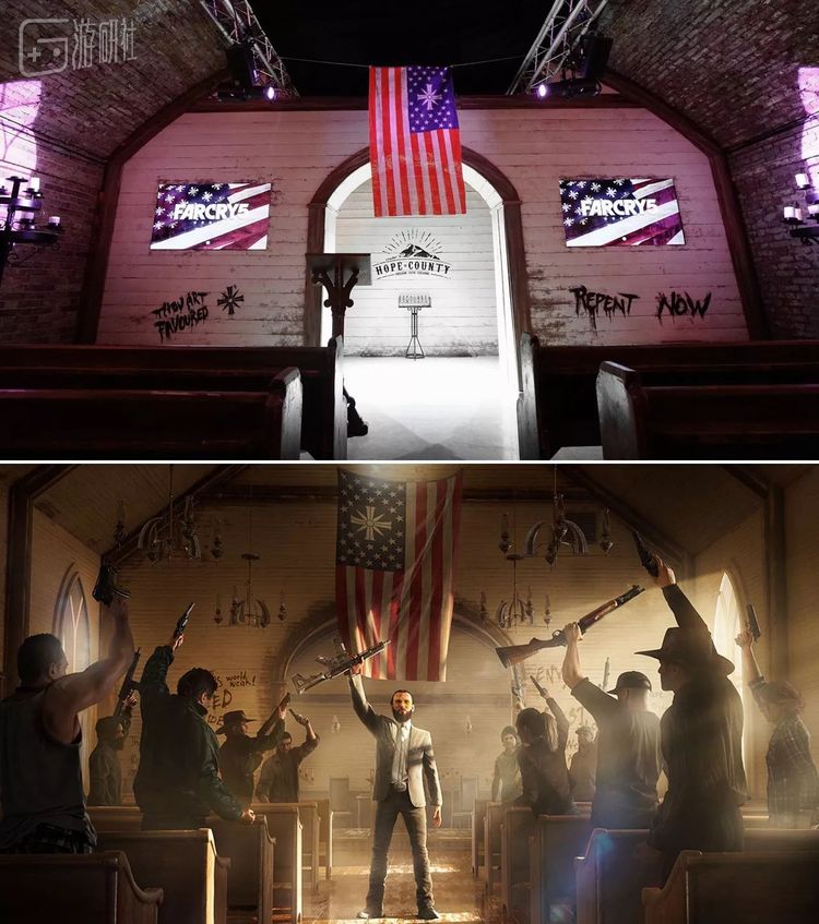 他们带我来到了酒吧后身的一所小教堂,这里顶棚挂着教旗,墙上涂鸦“忏悔吧”,教堂的桌子也刻着潦草的笔迹,一副邪教聚集地的架势。按照故事背景,这里是希望镇邪教组织“伊甸之门”集会的教堂。而玩家的任务,则是以警长的身份前来此地调查并“解放”当地居民。