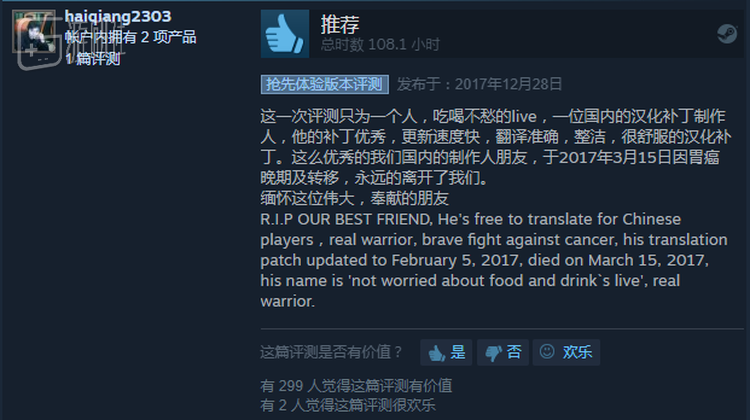 但是在2017年3月,“吃喝不愁的Live”却因胃癌离世,而他却一直坚持更新汉化补丁直到2017年2月5号。即使是在病床上,他仍旧积极乐观地回答大家的问题,却对自己的病情只字未提。当他离世之后,玩家才知道真相。