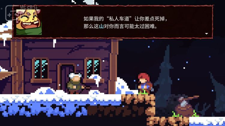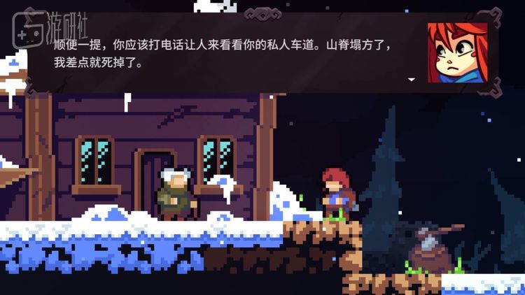 主角Madeline定了定神,走到安全小屋之后,赶紧给当地老太汇报后方山路的险状。