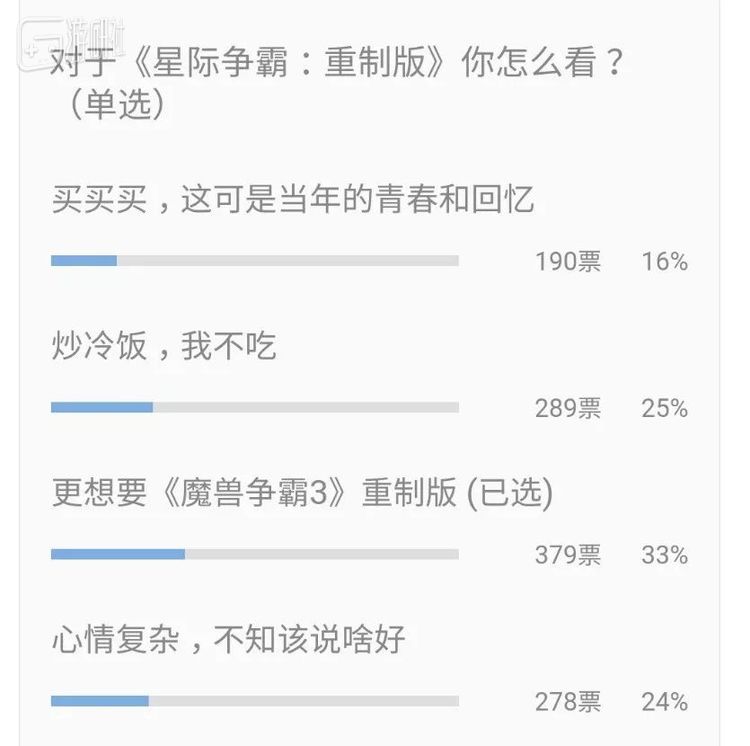 支持星际1重制的投票人数是最少的,而想要重制《魔兽争霸3》的投票人数是最多的