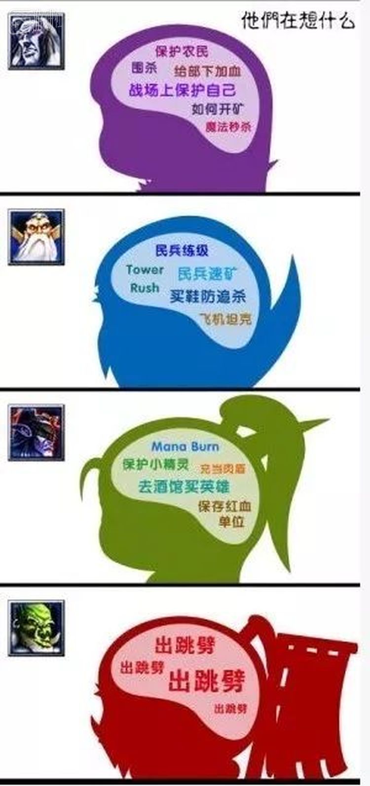 关于跳劈这个梗,几年前有人画了条漫吐槽过,大意是其它三族的英雄都在考虑各种战术,而剑圣满脑子都是“跳劈跳劈跳劈”。