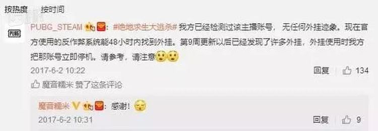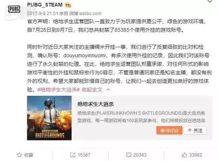 但是不久后,《绝地求生》的官博就发布了一条信息,称在“反复细致的比对和检测,确认账号:douyumoyinnuomi,有多次使用外挂的记录”。