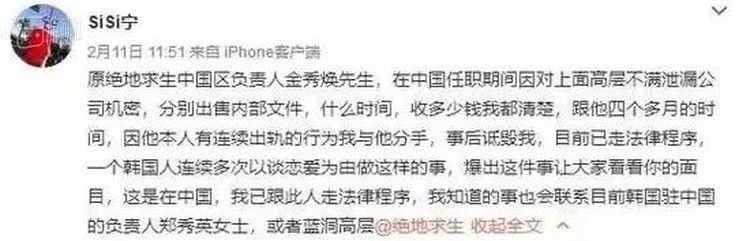 这位自称金秀焕前女友的“SiSi宁”因为分手和一系列矛盾,在微博上爆料了不少金秀焕的内幕,其中包括“出售内部文件”这种事情。