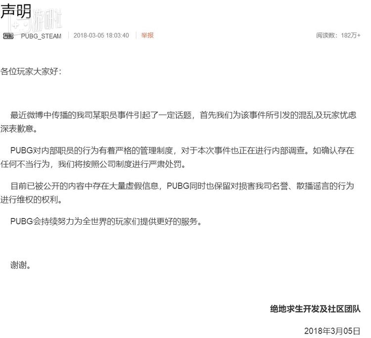 再加上,《绝地求生》官博马上发布了一条声明,称“最近微博传播的我司某支援事件引起了一定话题”、“PUBG对内部职员的行为有着严格的管理制度”、“目前已被公开的内容中存在大量虚假信息”。