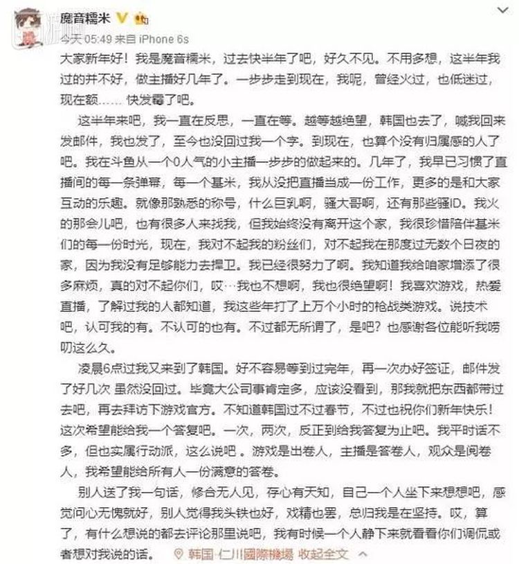 2月27日5点49分,魔音糯米又在微博发了一段长文,描述了自己最近半年的状态,以及会继续前往韩国蓝洞官方求证。
