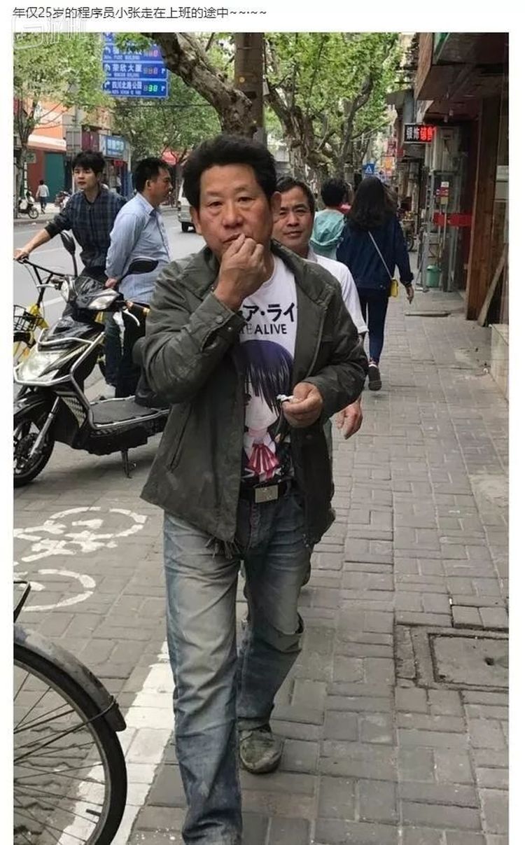 这位不知名大爷穿痛衫的照片也流传许久,总感觉这是个有故事的人。