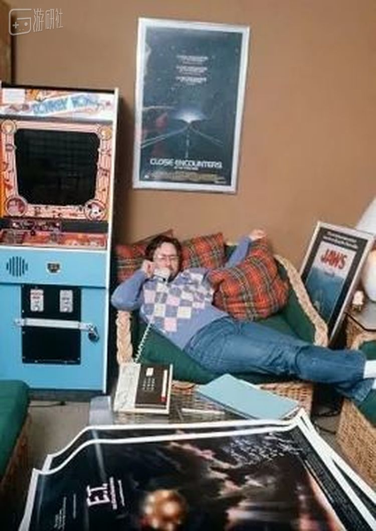 还有一张老照片是这样的:斯皮尔伯格窝在工作室里打电话,旁边是刚刚印出来的《E.T.》海报,以及一台1981年的“新游戏”《大金刚》。