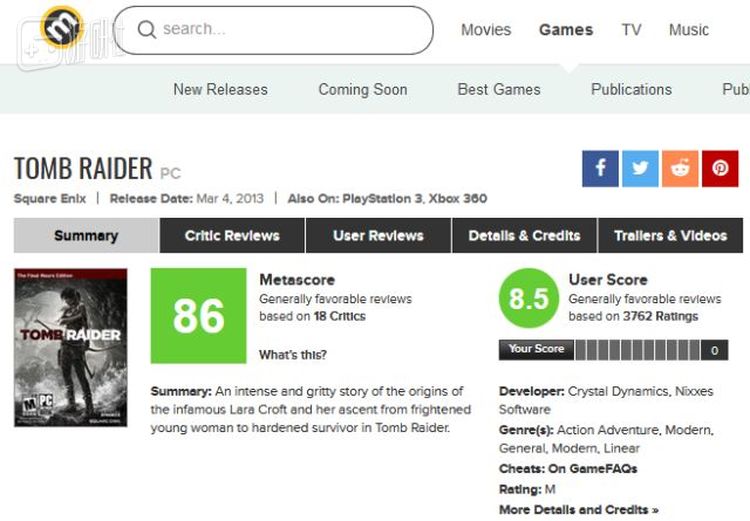 重启后的《古墓丽影》在综合评分网站MC的平均分为86