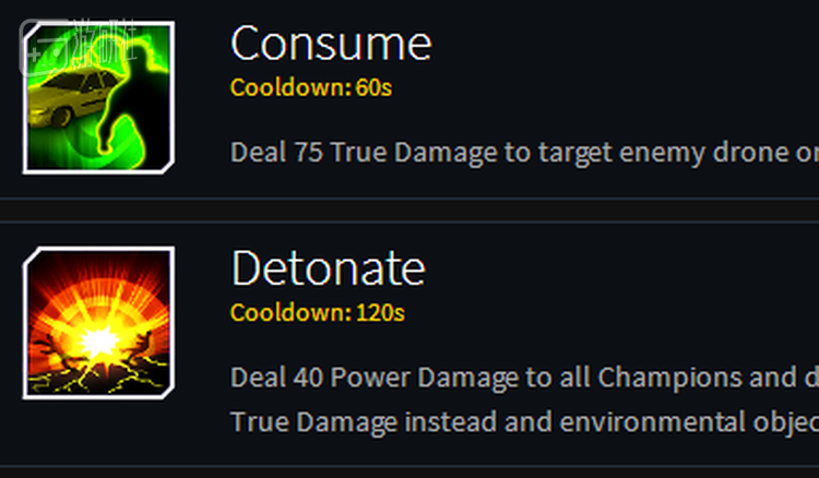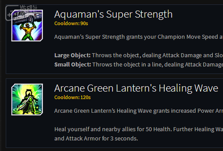 而与《LOL》相似的是这里你也需要携带两个“召唤师技能” ,这里叫做Stolen Power。和《LOL》的召唤师技能大同小异。有两类,一类是海王的超级力量或者钢骨的传送一类的东西, 称为Enhanced Stolen Power,这类技能强度相对高一些只是需要去商店购买。
