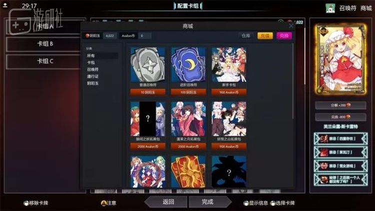 东方梦符祭的付费机制,以地图内的商城形式体现。游戏为新玩家提供随机卡组,D1通关后,容许玩家自选卡组进行游戏。在不购买任何扩展卡的情况下,提供的自定义初始卡,在数量上满足自选卡组所需。