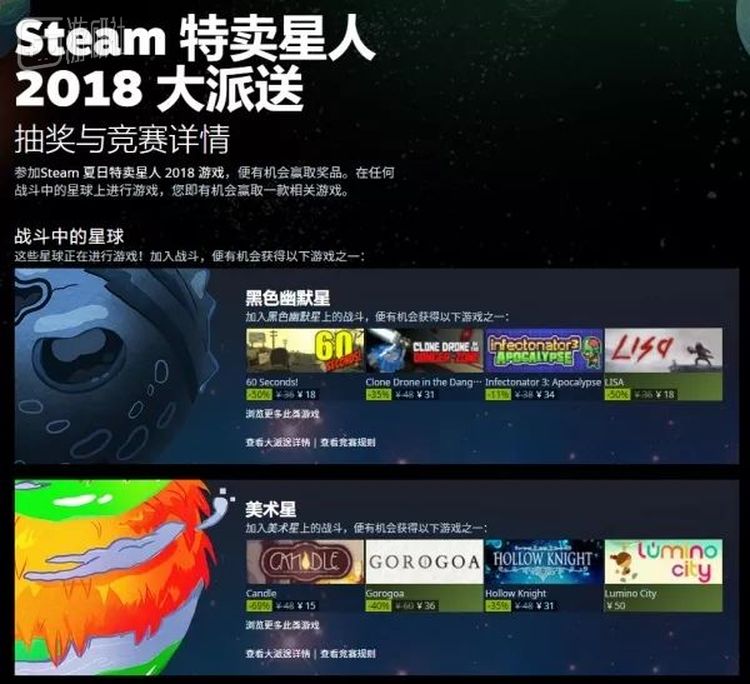 总的来说,好处多多。夏日特卖星人游戏也将在北京时间7月5日(夏促结束前一天)凌晨1点结束,为期13天,现在点进Steam商店首页就可以玩。