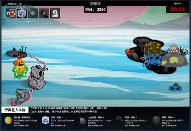 会有《植物大战僵尸》般一波又一波的外星人从右往左进攻,玩家用鼠标左键点击以发射射线枪,按下数字键1、2、3、4、5,向鼠标位置发动特殊攻击,消灭不断进攻的敌人。