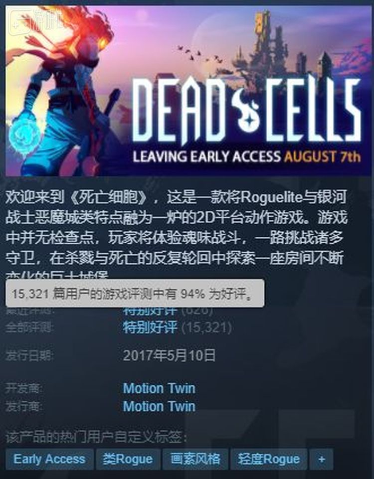 《死亡细胞》(Dead Cells)是一款银河战士恶魔城类的横版动作游戏,自2017年在Steam 上开启抢先体验,至今已售出70多万份。凭借其极高的质量,这款游戏在Steam上拥有94%的好评率,叫好又叫座,和《空洞骑士》一起成为了今年最为成功2D横版游戏之一。