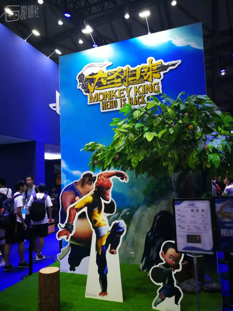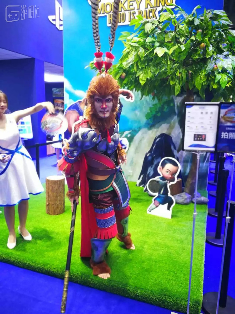 在这些国产游戏中,最引人注目的肯定要数《大圣归来》。除了大量的试玩机位,《大圣归来》还有一个合影区,上面放着主要角色的展板和一棵桃树,不时会有一位身穿盔甲的大圣Coser在此驻足给人拍摄,在相对“朴素”的索尼展区里颇为显眼。