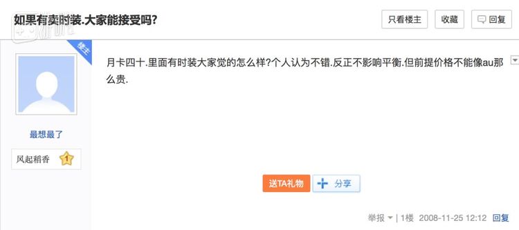 有意思的是,他还特意提了一句“价格不能像au那么贵”——au其实就是《劲舞团》的缩写,此前就频频因为“游戏里一件内裤比现实中卖得还贵”而受到争议。2008年6月还有人撰文批评,认为游戏内的时装系统引发玩家攀比心理,不花钱买时装的玩家会被其他人踢出房间并被蔑称为“农民”。
