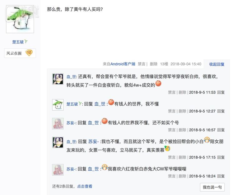 而更戏剧性的是,只要这些外观被“拆封”穿到了角色的身上,就会立刻大幅贬值。与售价达到了40000元的“五红”发型本身相比,一个有“五红”的角色往往售价仅在14000元左右,考虑到这样的角色一般都是花费很多心血、积累了大量其他道具的情况,贬值的幅度可以说是相当严重。