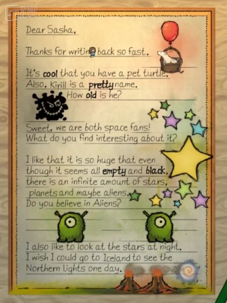 游戏语言为英文,解谜也是以文字为核心,但文章的书写用语并不难。主人公被设定为一个11岁的小姑娘,书信中稚嫩的文字,甚至与我们刚开始学写英语作文时的笔触有几分相似。