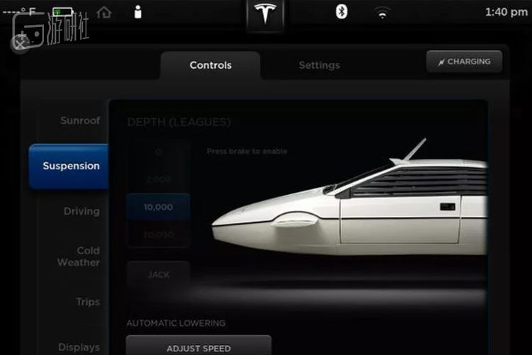 Model S有一个隐藏的“詹姆斯·邦德”模式,可以将汽车变成《007之海底城》里的潜艇车的模样——虽然你的车不可能变形,但至少在屏幕上看起来你已经变形了。