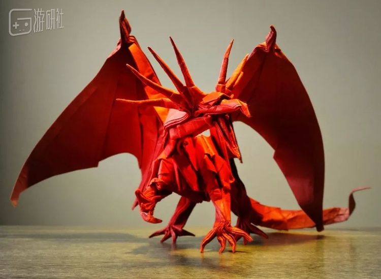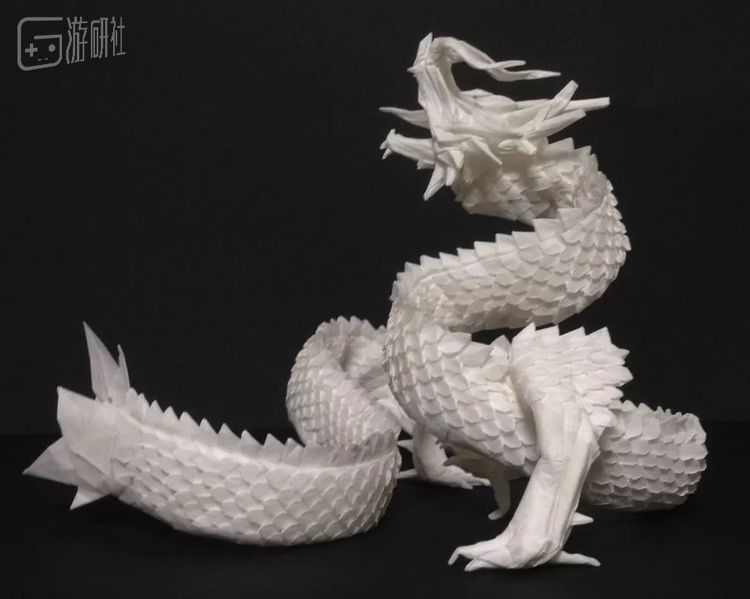 比如他折的这个龙。从爪子到鳞片,不用胶水,不用剪刀,全都用纸折出来。