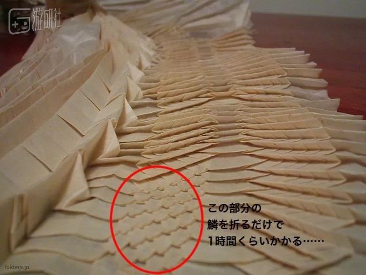 当然,这肯定不是什么休闲娱乐,光是类似的一小块鳞片,就要折上一个小时。这个叫做“龙神”的折纸雕塑,是他耗时三年半制作的代表作,估价超过上百万日元。