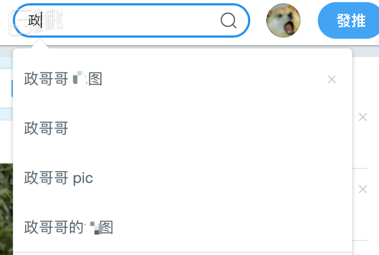 在热心网友的解释下,“政哥哥”这个爱称迅速蔓延开来,现在到推特的搜索框里输一个“政”字,八成都能看到这种推荐: