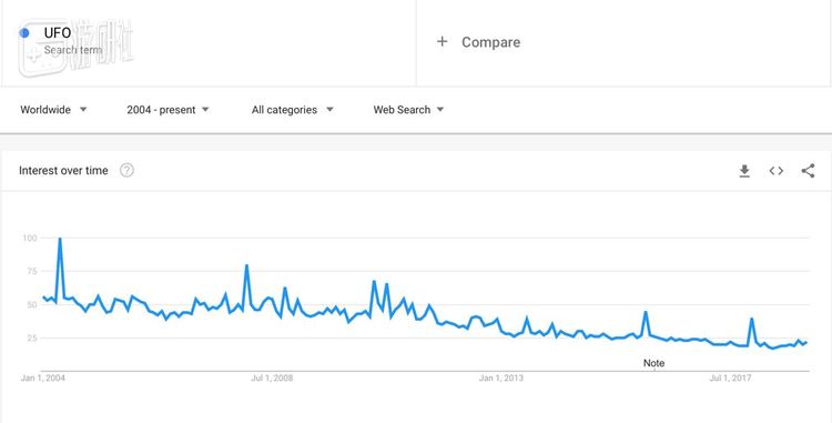 UFO的谷歌指数——可以看出这十年来UFO的关注度在逐年降低