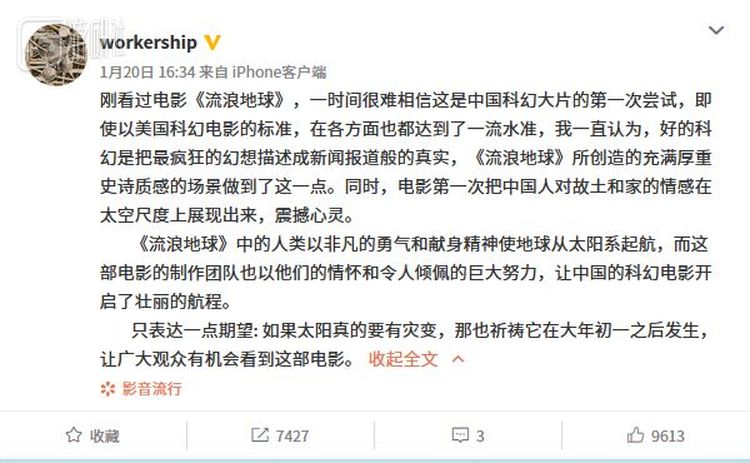 这部刘慈欣同名原著改编的科幻片将于大年初一上映,年前疯狂在各地点映,好评如潮,刘慈欣本人也到处出面,夸电影不错,一些电影媒体甚至开始提前把2019年定义为“中国科幻电影元年”。