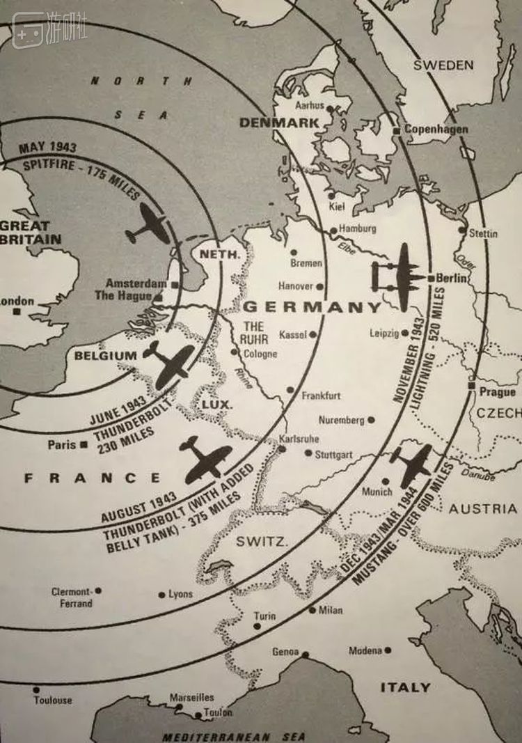 二战期间英美护航战斗机的航程对比。到了战争后期,从英国起飞的盟军护航战机已能覆盖几乎整个西线战场