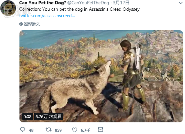 而之前提到的育碧也是一样,虽然在《全境封锁2》中没法撸狗,但是在《刺客信条:奥德赛》里育碧却给玩家提供了机会: