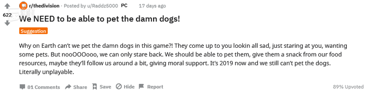 2年过去了,这批爱狗人士们最近又遇到了新的难题:在《全境封锁2》中,他们又一次面对可爱的狗狗而束手无策了。这一次,痛苦的玩家在Reddit论坛上发帖来表达自己的纠结心情: