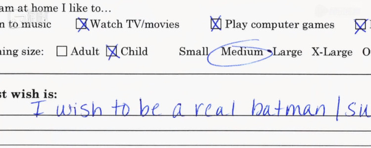 这是一个看上去并不可能实现的愿望——不是“想要蝙蝠侠的玩具”,不是“想见到蝙蝠侠”,而是“我想成为真正的蝙蝠侠”。