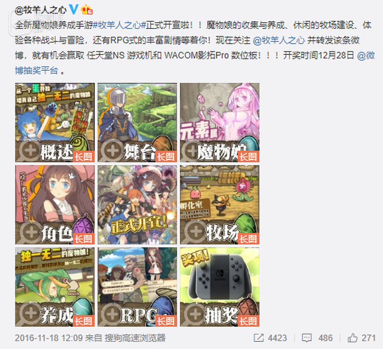 在前期漫长的研发过程中,团队成员基本处于闷头开发的状态,产品一直没有得到市场的检测。唯一的一次内测结束后,根据测试的结果做了优化修改。在此时,大家都迫切想知道这个游戏能否被广大玩家所接受,大根觉得也是时候对外公布牧羊人之心这款游戏了,便总结了游戏的几个特点,制作了一条九宫格微博发了出去。